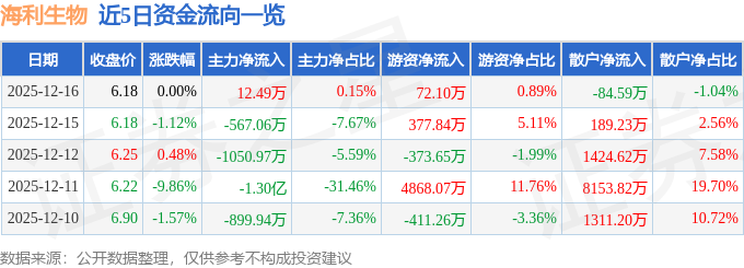 本站消息,截至2025年12月16日收盘,海利生物(603718)报收于6.18元,上涨0.0%,换手率2.0%,成交量13.01万手,成交额8103.08万元。