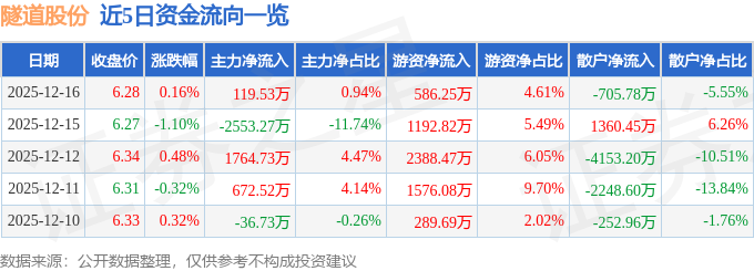 本站消息,截至2025年12月16日收盘,隧道股份(600820)报收于6.28元,上涨0.16%,换手率0.64%石油东南亚,成交量20.26万手,成交额1.27亿元。