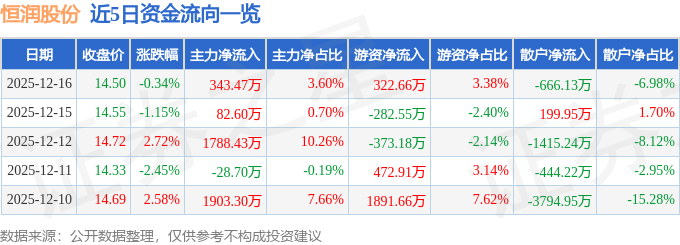 12月16日的资金流向数据方面,主力资金净流入343.47万元,占总成交额3.6%,游资资金净流入322.66万元,占总成交额3.38%,散户资金净流出666.13万元,占总成交额6.98%。